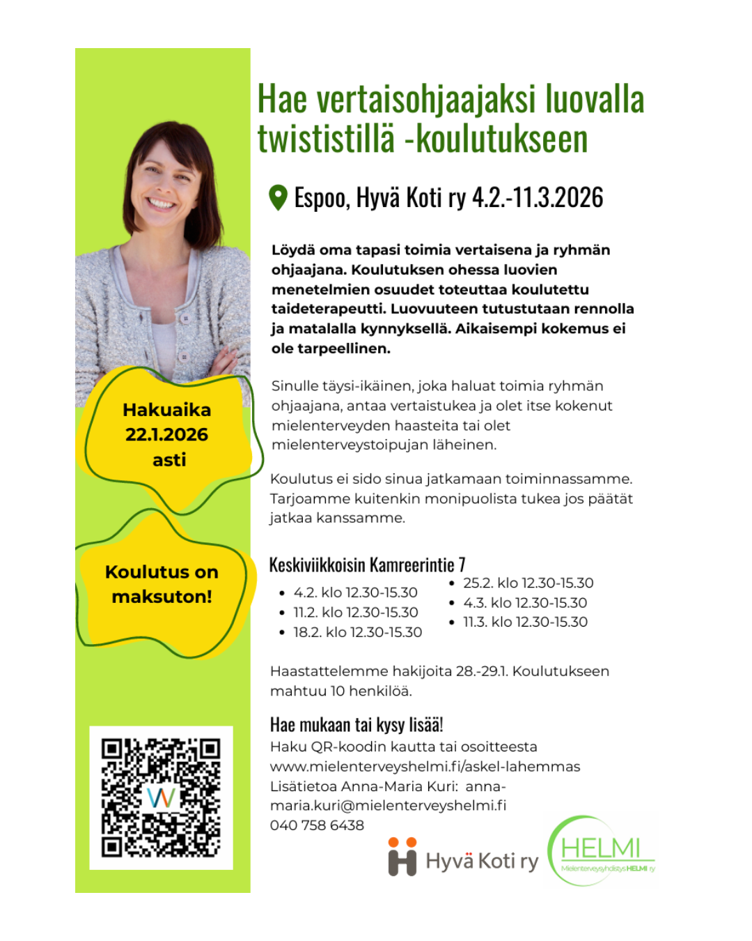 Vertaisohjaajakoulutukseen ovat lämpimästi tervetulleita Hyviksen entiset ja nykyiset kävijät, omaiset, ystävät, vapaaehtoisuudesta kiinnostuneet. Luovan osuuden ohjaa Hyvä kodin toiminnanjohtaja Marika Taskinen. Koulutukseen osallistuminen ei sido siihen, että aloittaa vertaisena/vapaaehtoisena. Iltapäiväkahvit ja pieni suolainen/makea. Koulutus on maksuton.