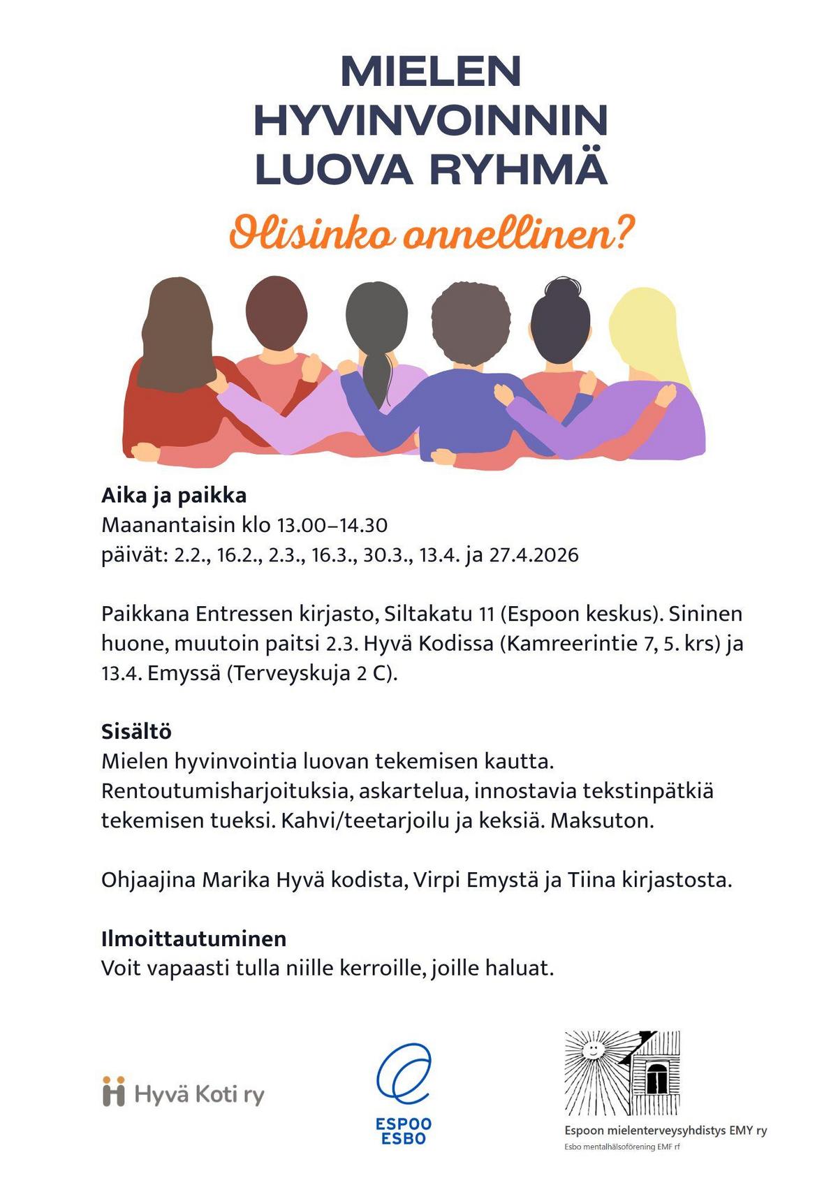 Vertaisohjaajakoulutukseen ovat lämpimästi tervetulleita Hyviksen entiset ja nykyiset kävijät, omaiset, ystävät, vapaaehtoisuudesta kiinnostuneet. Luovan osuuden ohjaa Hyvä kodin toiminnanjohtaja Marika Taskinen. Koulutukseen osallistuminen ei sido siihen, että aloittaa vertaisena/vapaaehtoisena. Iltapäiväkahvit ja pieni suolainen/makea. Koulutus on maksuton.